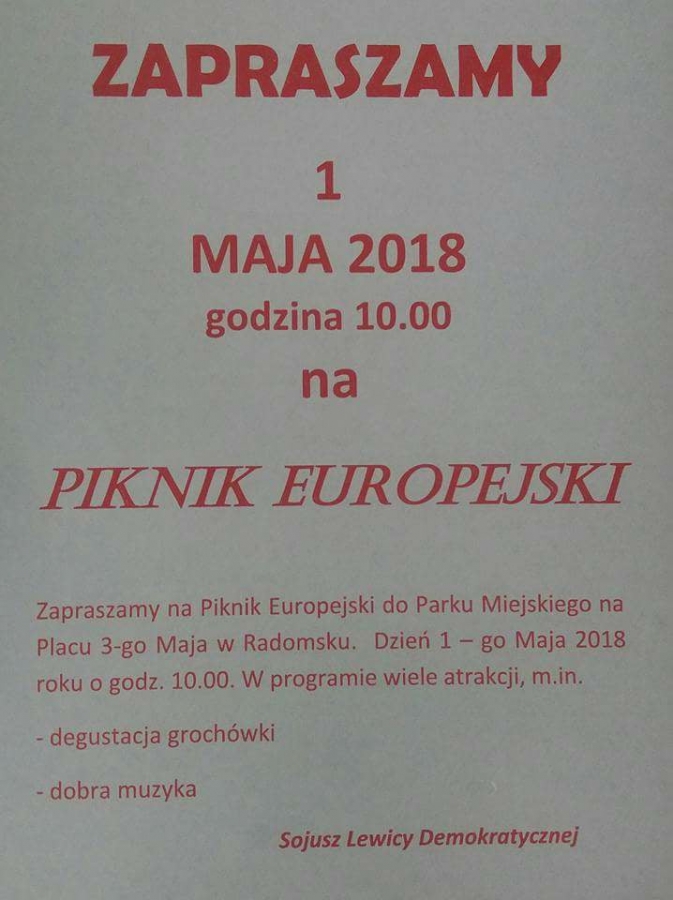Jak co roku będzie można także wziąć udział w Pikniku Europejskim organizowanym przez SLD w Radomsku. Podczas pikniku, który rozpocznie się o godz. 10:00 w Parku Miejskim na pl. 3-go Maja, spróbować można będzie grochówki, a czas umili dobra muzyka.